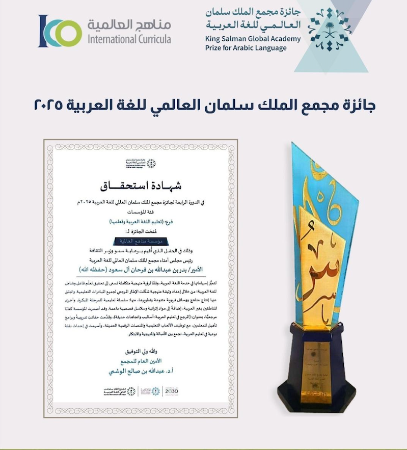 حصلـــت مؤسسة مناهــج العالمية على جائــزة مجمــع المــلك سلمـــان العالمي للغة العربية فــي عـام 2025 فـي فرع تعليم اللغة العربية، تقديـرًا لجهودها المستدامة. تميـــزت المـؤسسة بتصميم منـاهج تعليمية متـــدرجــة تنـاســب مختـلف المستــويــات، واستخــدام التقنيــات الحديثــة، مــع التركيز علــــــى الجـودة الأكاديمية وتوسيـع خدماتها محليًــا ودوليًا. اعتبــرت لجنة الجائــزة أن ما تقدمـــه "مناهــج" يمثــل نــمــوذجــاً يــمــكــن تعميمه.